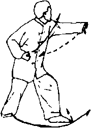 两臂相抱要贴近身体,两脚的左摆右扣与上体的左转要上下 相随,协调一致。左掌撩击要有抖擞劲,右臂下落要有采劲。
