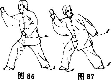 ④两脚尖向右摆;上体随之右转,重心移至右腿成右弓步; 同时,右臂随体转由左向右弧形摆动,拳至右肩上方时,右拳外 旋,经左臂内侧向右侧上钻,高与鼻齐,拳心向上;左拳继续由 右肩前下落,拳心向下收停于腹前;目视右拳(图86)。