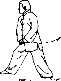 上体微向左转,左脚向后撤一步,右脚 随之向后拖移约一脚之距,两腿屈膝前弓, 重心略前移;同时,两拳变掌前伸,掌心相 对,由身前向怀中捋,两掌握拳,停于腹前, 上体略向前倾;目视前方(图93)。