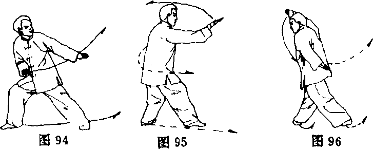 ③右脚内扣,身体向左转,左脚向右腿后倒插一步,前脚掌 着地,两腿微屈;同时,左掌下落经左腰侧内旋反臂向后伸插; 右臂屈肘停于头右上方,掌心向外;目视前方(图96)。