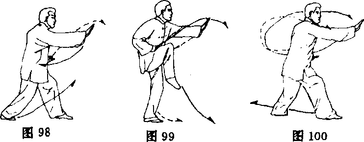 ⑤重心略前移成左弓步,同时,左掌收 回于腹前,掌心向下;右掌在左掌回落时经 左掌背搓擦向前插击,掌指向前,掌心向下, 高与眼齐;目视右掌(图98)。