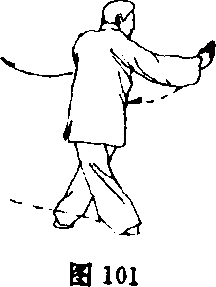 ⑦右脚前落踏实,两腿屈蹲成三体式步;同时,右掌经左掌 背向前搓擦插击,掌心向下,掌指向前,高与眼齐,左掌收回左 腹前,掌心向下;目视右掌(图100)。