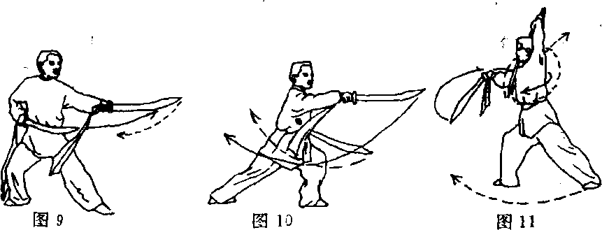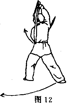 ①身体右转;同时,右手握刀随之向右拉摆,左手扣腕提肘 使刀尖下垂、刀刃朝外向右绕至右肩前(图11)。