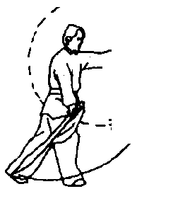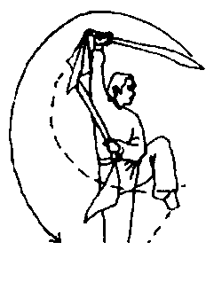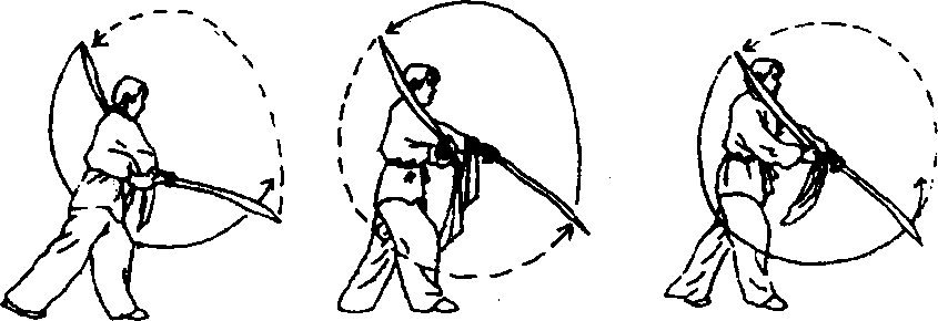 ①左脚后落;同时,右手握刀由上经后绕至体右侧下方,左