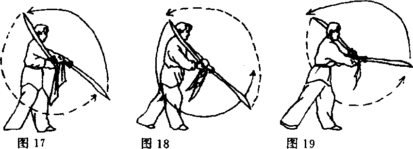 ④右手刀向上绕至右肩外侧,同时左手刀向下经体右侧绕至 体前;目视左手刀(图18)。