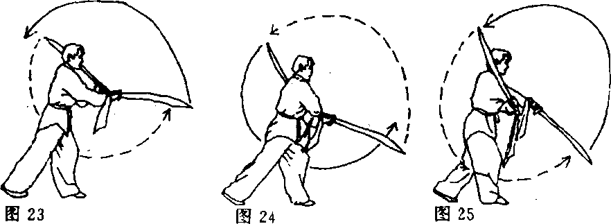 ⑨右手刀向下经体右侧绕至体前,同时左手刀向上绕至左肩 外侧;目视右手刀(图23)。