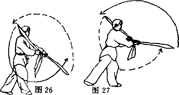 ?右手刀向上 绕至右肩外侧,同 时左手刀向下经体 右侧绕至体前;目 视左手刀(图26),