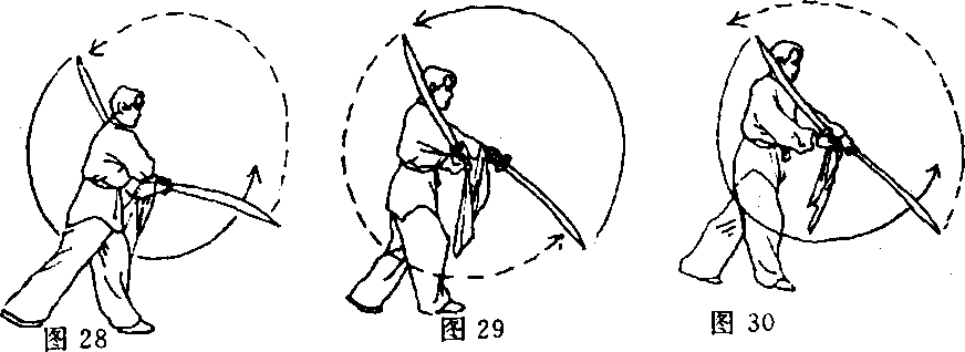 ?右手刀向上绕至右肩侧,同时左手刀向下经体右侧绕至体前; 目视左手刀(图30)。