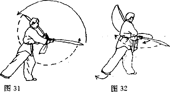 ?右手刀向下 经体右侧绕至体 前,同时左手刀向 上绕至左肩侧;目 视右手刀(图31)。