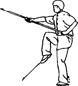②左腿直立支撑,右腿屈膝提起;同时,双手持刀由胸前向前