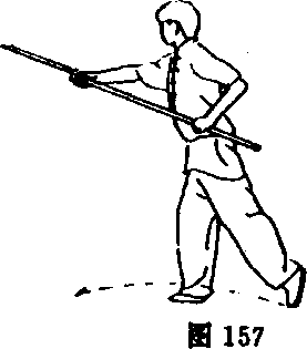 ①右腿向前落步,左脚跟抬起;同时,双手持刀抱于体前,刀 刃朝左;目视前方(图157)。