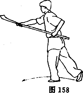 ②左腿上步,右 脚跟抬起;双手持力 抱于体前,刀刃朝左; 目视前方(图158)。