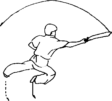 ⑤右腿经左腿后,撤步成 插步,脚跟抬起,左腿直立前; 同时,双手持刀随身体右转撩 至身体左前方,刀刃朝上;目 视刀身(图166)o