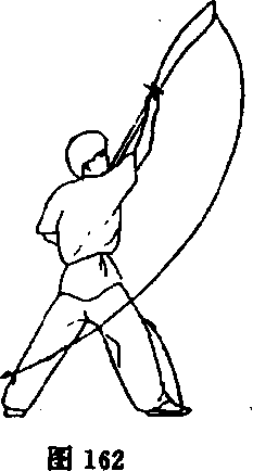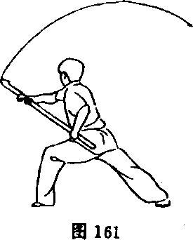 右、左脚依次落地;同时,双手持刀由后向前成左弓步立圆劈 刀,刀刃朝下;目视刀身(图161)。