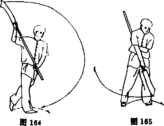 ④左腿上步到右腿前;同时,双手持刃由上至下成立圆撩至于 身体前侧,刀刃朝后;目视刀身(图165)。