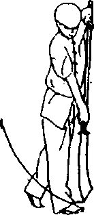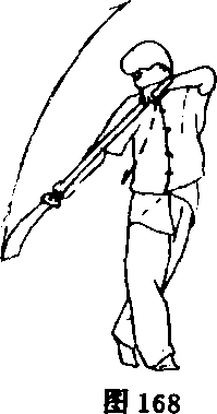 ⑥左腿直立,左脚跟抬起, 右腿直立在前;同时,双手持 刀随身体右转继续撩刀,由后 向前成立圆撩至于体前,刀刃 朝后;目视刀身(图167)。