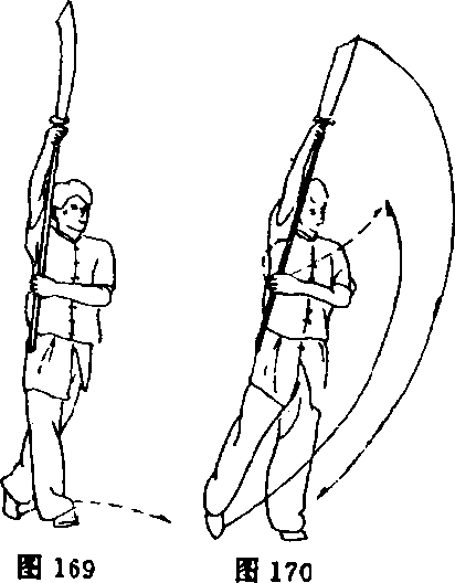 ⑦左腿直立,左脚跟抬起,右腿直立在前;双手持刀由体前随 身体右转撩至身体右后侧,刀刃朝上;目视刀身(图168)。