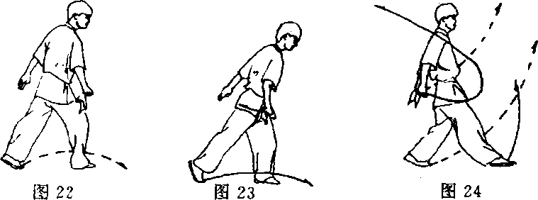 ③迅速上右步,保持重心;同时,两臂后摆(图24)。