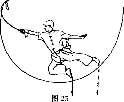 ④上动不停,右脚随即 蹬地跳起右转身,右腿屈 膝,左腿伸直;同时鞭向前 上方放出;目视前上方(图 25)。