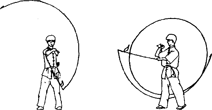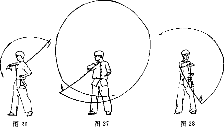 ①右、左腿依次落地;鞭由前下绕至体后下方时,小臂屈肘内 收,肘关节向外伸出,使鞭搭在大臂后下侧,然后鞭再继续绕至体 后上方(图26)。