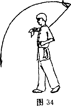 ?鞭在身体右侧绕行一周后,右肘横肘伸出,使鞭搭于大臂上; 身体左转约90度(图36)。