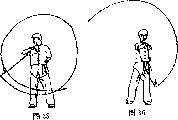 顿右肘自右经前上向左弧行绕动,同时鞭头自右向上方经前绕 至右前下方(图35)。