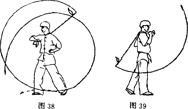 ?鞭在身体右侧继续绕行一周后, 外伸右肘,使鞭搭至大臂后下侧(图 38)。