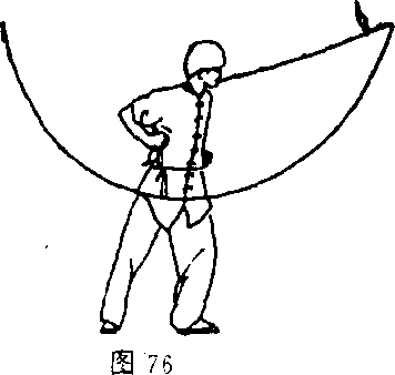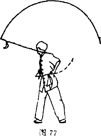 ②头自左经下向右弧行甩动,随之上体 向右拧转,使鞭向下经体前立圆向右上绕动 (图 77)。