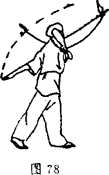 ③上动不停,头经上向左后甩动,上体 随之左转,使鞭头经上向左下绕动,左臂顺 势打开(图78)。