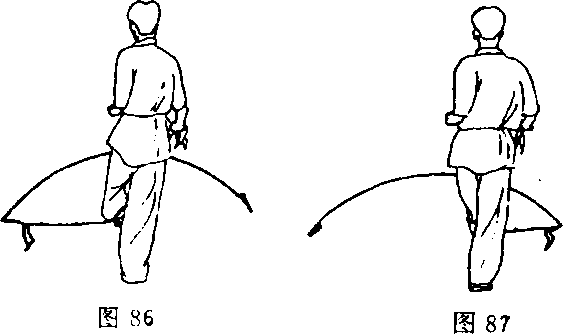 ④左腿自前经左向后拨绕,使 鞭自腿前向左后平扫(图88)。