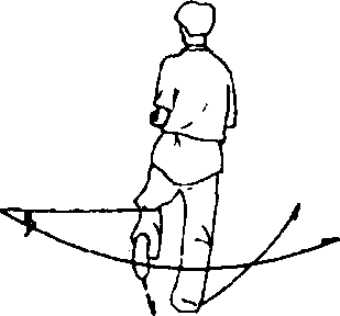 ②身体向左翻转半圈,两 脚开立;同时,使鞭自左上经 至右下(翻身后的左方)(图
