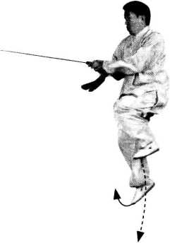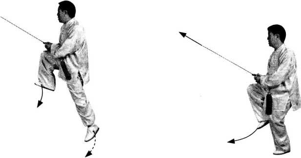 【要求】此势为垫步前姿势,用前 脚掌着地,利用足弓的弹力向前蹿跳, 但必须与身法相配合。