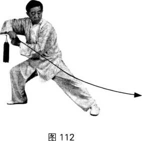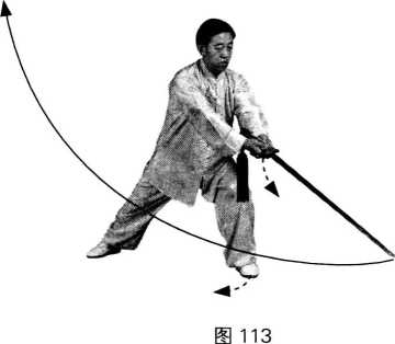 动作6:身体微左转,重心移至左腿成左弓步;同时,双手持剑随重心移动向左前 下刺剑,剑尖朝前下;目视剑尖。(图113)