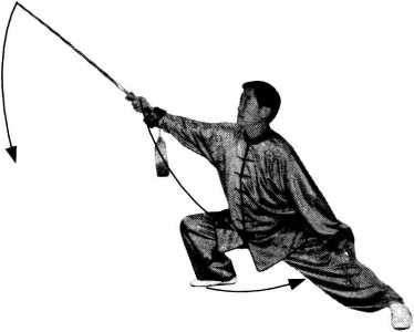 【要求】迅速扭腰转胯,旋臂折腕,剑尖迅速转向左下方。