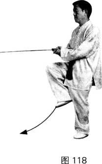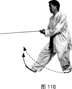 动作2:右脚向前落地,脚跟着地,脚尖翘起,左腿稍屈膝,重心在左腿;上体保 持原姿势不变。(图116)