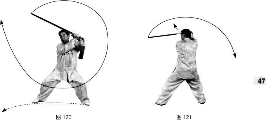 动作2:重心移至右腿,提左脚经右脚内侧向前上一步,身体向右转180。;同时, 双手持剑经身体左侧转体撩剑;目视剑尖。(图121)