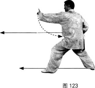 动作2:重心左移,提右脚经左脚内侧向前上一步,重心前移成右弓步,随上步身 体向左转180。;同时,右手持剑向前平刺,手心向上,左手剑指下合至左腰间,手心 向上;目视剑尖。(图124)