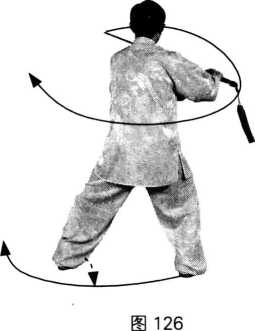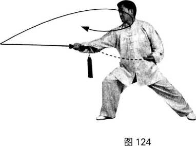 随转体合力推剑平抹,剑尖朝左;身体右转90。;目随剑尖。(图126) 【要求】上左步时,可以跳步;转体随腰劲抹剑,力达剑尖。