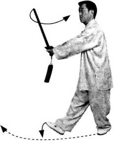 【要求】重心左移、提右脚外摆、旋剑 里合协调一致。
