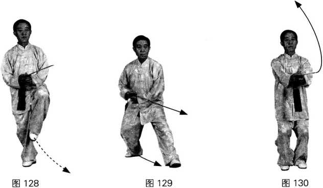 动作5:右腿屈膝下沉,左脚向前落步,脚跟着地,脚尖上翘;上体姿势不变。 (图 129)