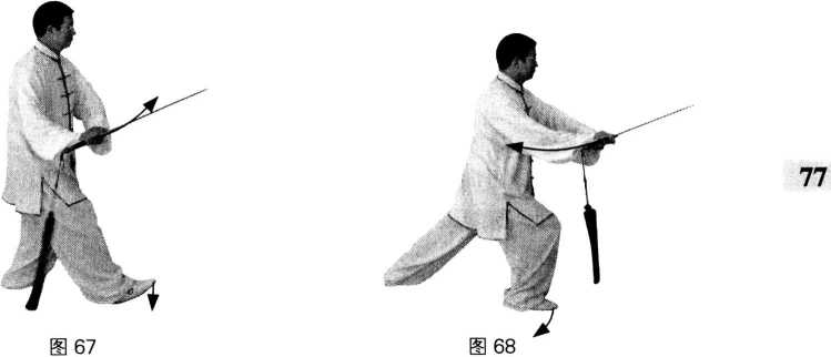动作2:身体微向右转,重心移至右腿,右腿屈膝慢慢向前弓出,右脚全脚掌踏 实,成右弓步;右手握剑,向前引伸,腕与胸平,手心向下,剑尖向左前;左手剑指仍 附于右手腕部;眼视剑尖方向。(图68)