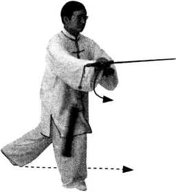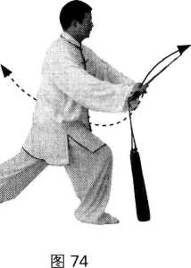 78 出,脚跟先着地,身体再向右转;同时,右手握剑随腰右转前臂内旋,翻转手心向下, 屈臂向右后方斜带剑,腕与腰平,剑尖向左前;左手剑指仍附于右手腕部;眼视剑尖方 向。(图72、图73)