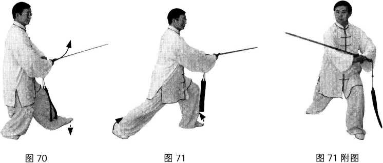动作2:身体微向左转,重心移至左腿,左腿屈膝慢慢向前弓出,左脚全脚掌踏 实,成左弓步;右手握剑向前引伸,腕与胸平,手心向上,剑尖向右前;左手剑指仍附 于右手腕部;眼视剑尖方向。(图71、图71附图)