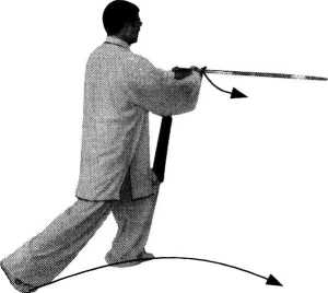 【要领】向前引剑,剑尖略高,仍控制在身体中线附近。