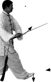 动作2:身体微向右转,重心移至右腿,右腿屈膝慢慢向前弓出,右脚全脚掌踏 实,成右弓步;右手握剑向前引伸,腕与胸平,手心向下,剑尖向左前;左手指仍附于 右手腕部;眼视剑尖方向。(图74)