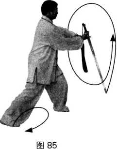 动作1:接上势。身体向右转,左脚尖内扣135。,重心在左腿,右脚提起向右前绕 步迈出,脚跟先着地;同时,右臂内旋,转动手心向内,右手剑尖做一立圆经面前绕剑 于腹前,腕与腹平,剑尖向左;左手剑指随右手绕剑附于右手腕部,手心向下,剑指向 右;眼随体转向前平视。(图85、图86)