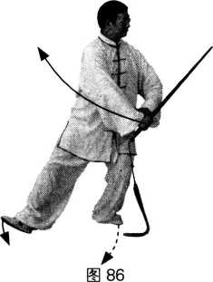 动作2:身体继续向右转,重心移至右腿, 左脚提起顺势调整动作方位,成顺势;右腿慢慢 向前弓出,成右弓步;右手握剑自腹前向右平 带,腕与胸平,手心向下,剑尖向左;左手剑指 附于右手腕部,手心向下,剑指向右;眼随体转 向前平视。(图87)