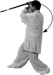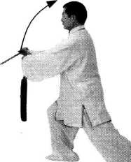 【要领】身体转为正向,撩剑时剑尖高于剑 把,剑身在身体中线;腰的转动带动剑的撩出, 立身中正,敛臀;松肩,双臂自然撑圆。