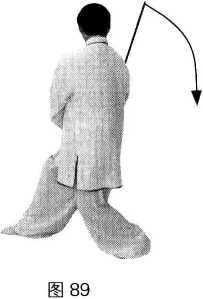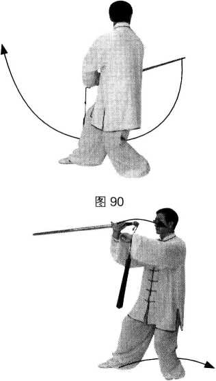 动作1:接上势。身体向右转,重心移至左腿,成左坐步;随体转右臂微内旋,翻 转手心向外,右手剑立剑刃经面前向体右后立圆环绕,腕与腰平,剑尖向右后;左手剑 指随体转仍附于右手腕部;眼随体转向前平视。(图88—图90)