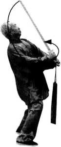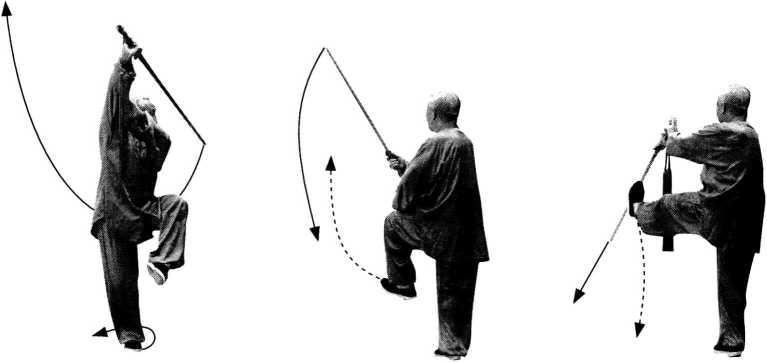 【要点】①本势要求保持持久性平衡动作的稳定,在保持右独立步不变中完成向左 转体270。,难度较大;向左转动中左脚尖上扬外摆以助转体合力。②剑向左肩外插落 时应以保持剑尖弧线下落,不可屈右臂,剑尖直线插落到左肩外。③剑向下插落与上挑 剑应随身体的左转连贯圆活地衔接,并保持力点在剑尖。